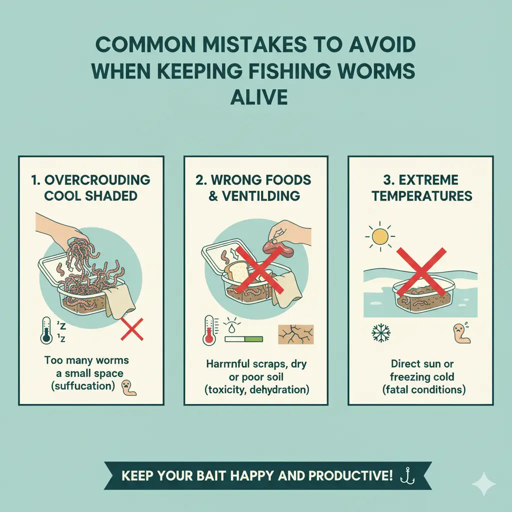 I když jsme se zabývali osvědčenými postupy pro udržení rybářských červů naživu, je také důležité být si vědom běžných chyb, které mohou vést k jejich předčasnému vyhubení. Vyvarováním se těchto chyb můžete maximalizovat životnost a vitalitu vaší návnady.Pojďme prozkoumat některé klíčové chyby, kterých se vyvarovat.