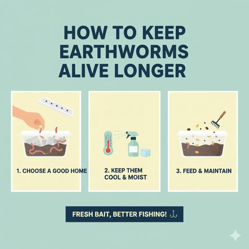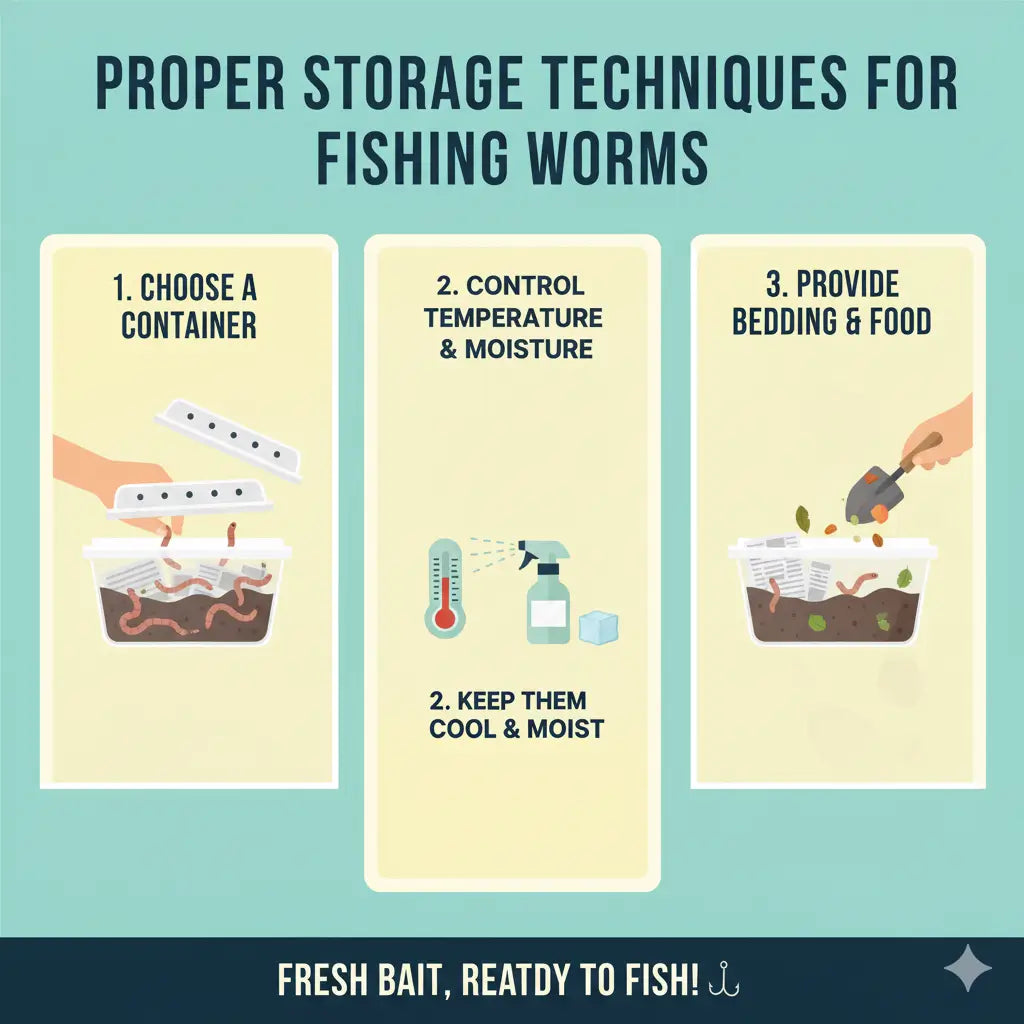 Pro dlouhodobé skladování udržujte podestýlku vlhké (ne mokré) a každých 7–10 dní přidejte malé množství jídla, pokud červy hned nepoužíváte. Dobrá podestýlka pomáhá červům zůstat aktivní, zdraví a připraveni lovit, ať jste kdekoli.