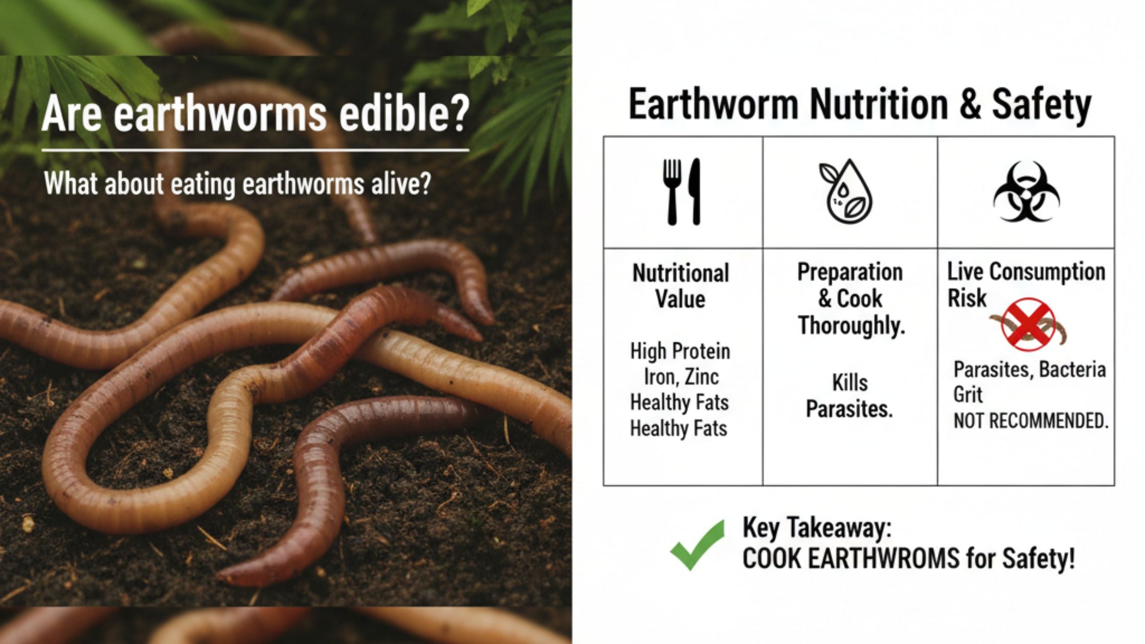Sim – tecnicamente você pode comer minhocas, e muitas culturas comem insetos e larvas como alimento nutritivo. Mas existem considerações reais de segurança: minhocas selvagens, vermes e parasitas podem transportar bactérias, parasitas ou toxinas. O fornecimento, a preparação (limpeza/cozimento) ou a compra adequada de fornecedores aprovados de insetos comestíveis fazem a diferença entre uma proteína segura e uma emergência estomacal (ou pior).